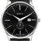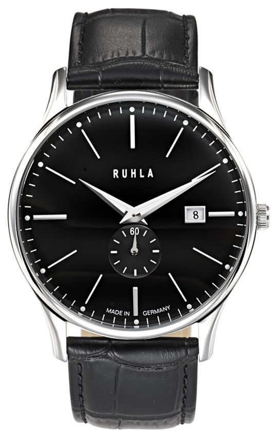•Uhrwerk Ronda 6004.D, quarzgesteuert •Datum auf 3 und kleine Sekunde •Edelstahlgehäuse, poliert •schwarzes Lederband •schwarzes Zifferblatt mit silbernen Indices • Mineralglas •wasserdicht bis5 atm •Durchmesser:42mm, Höhe:7,5 mm, Gewicht:55 g