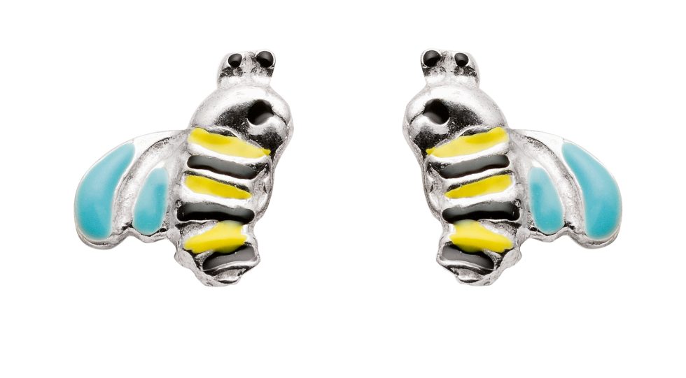Material: Silber Motiv: Biene gelb, schwarz, blau Bearbeitungsart: emailliert Breite: 8,2 mm Höhe: 7 mm